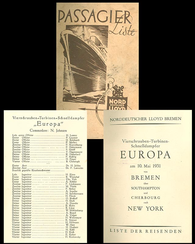Passagierliste der Europa unter dem Kommando von Kommodore Johnsen