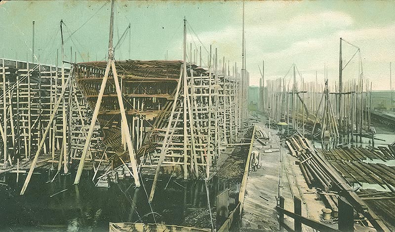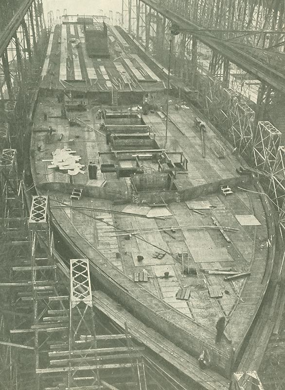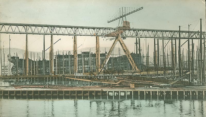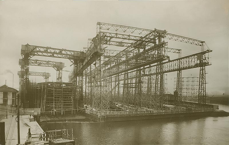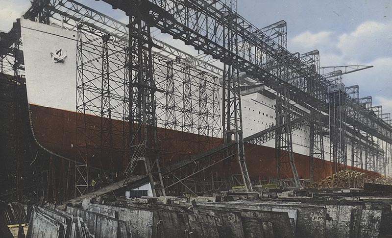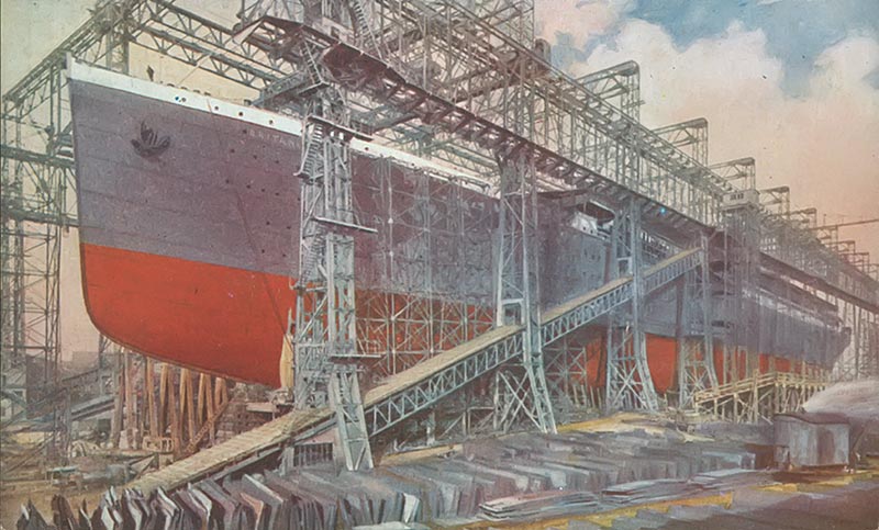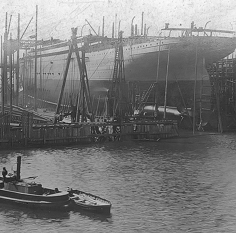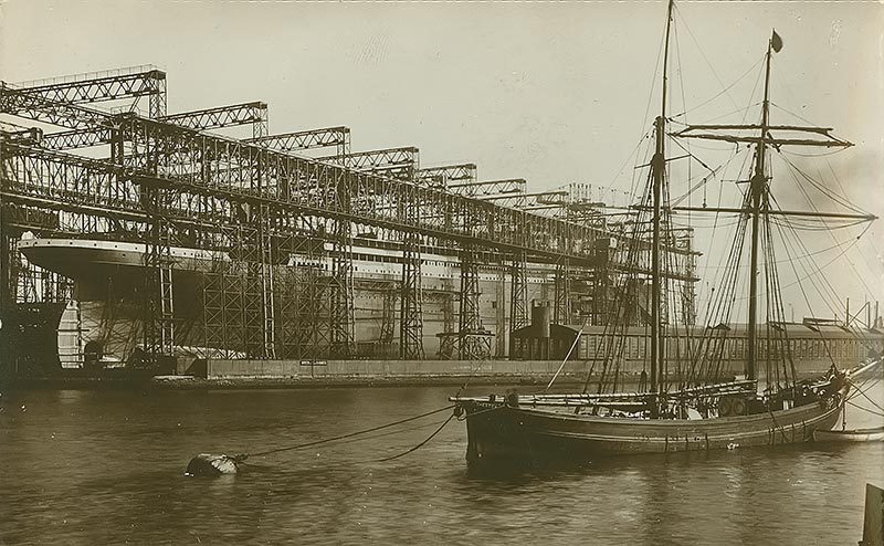 Blick auf die Helgen mit Olympic und Titanic bei Baubeginn.